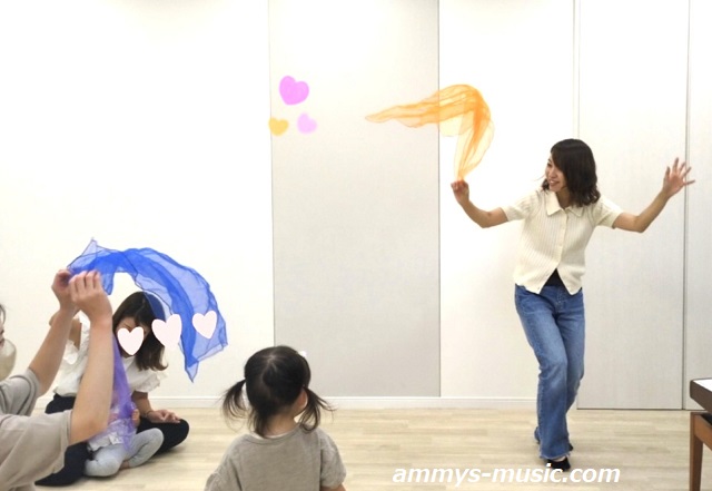 おばけになりきってスカーフを使い、 float up and low の動きをしたり、 peek-a-boo! と言いながら楽しそうに参加していた生徒さんたち😊