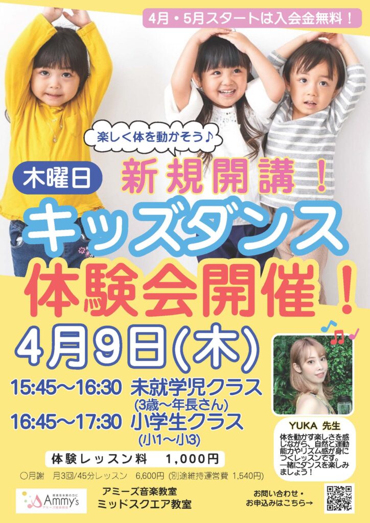 4月からの開講に先駆けて、木曜日キッズダンスの体験会を3月19日(木)15時45分~と16時45分~に開催いたします。