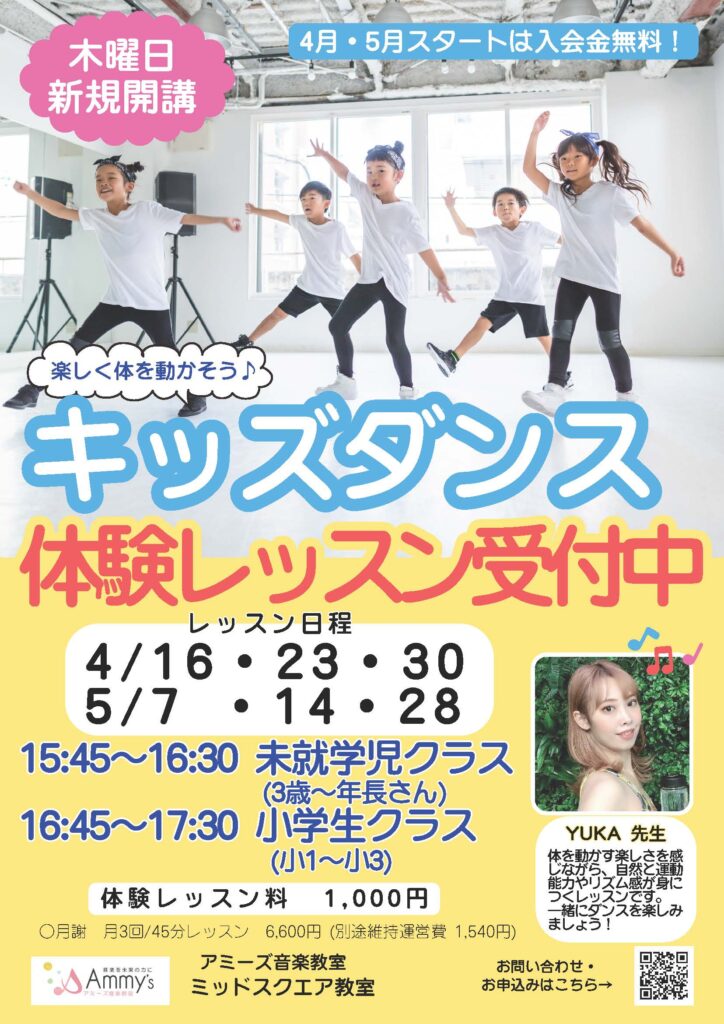 キッズダンスのレッスンは、ミッドスクエア教室で木曜日に開講しています。